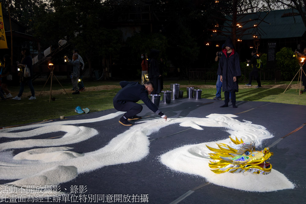 入園後,首先映入眼簾的是草地上的儀式。阿男道士以米為墨、以手為筆,勾勒出象徵護佑的「米龍」。隨著鼓聲與琵琶交織,整個場景顯得宏偉而肅穆,彷彿能看見神靈的氣息在指尖游走。
