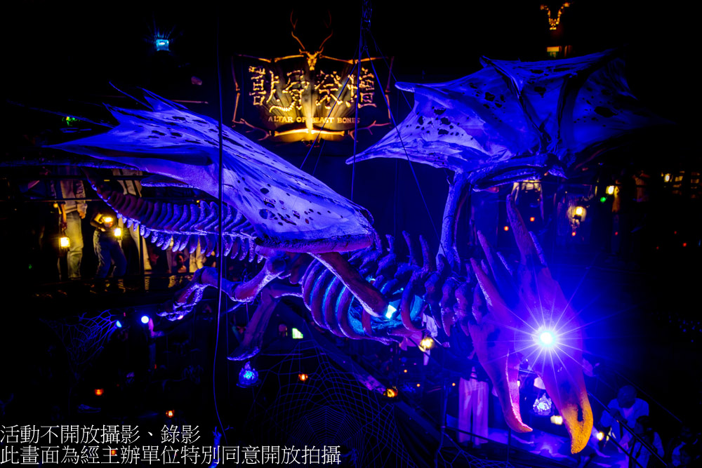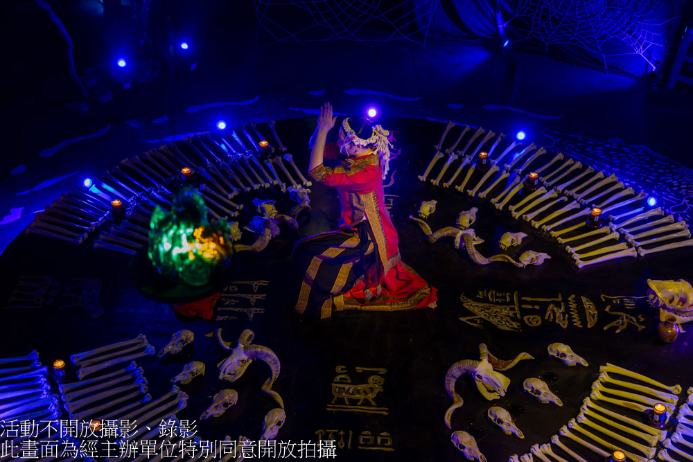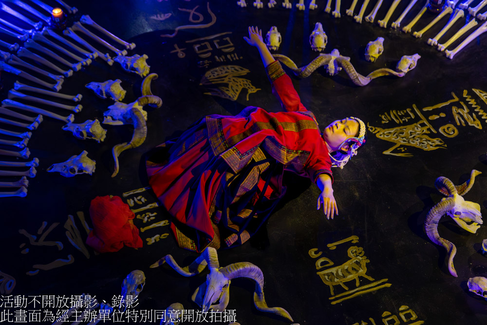 隨後轉往「獸骨祭壇」,仿真獸骨打造出的空間,瞬間將氛圍拉入魔幻與原始的祭祀現場。當那一襲紅衣的舞者緩緩現身,動作搭配樂音,營造出一種壓抑卻極致唯美的氛圍。觀眾彷彿被捲入一場古老的儀式中,身不由己地沉浸在那個如夢似幻的世界。